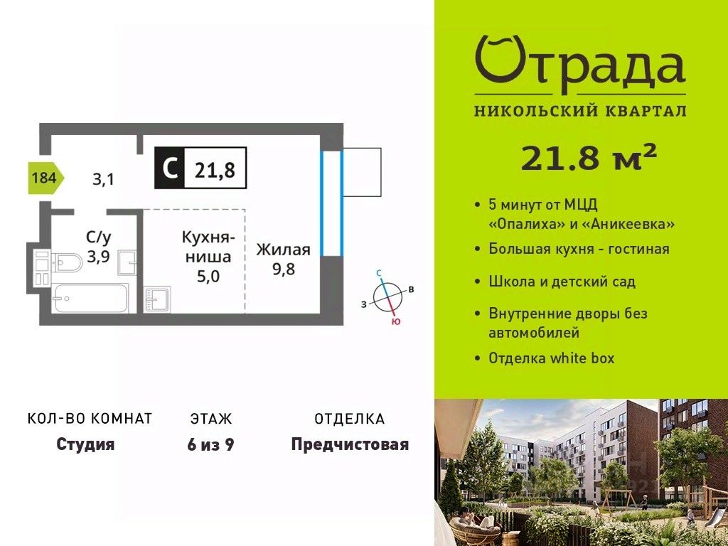 Квартира-студия с компактной кухней-нишей Квартира-студия с компактной кухней-нишей в жилом комплексе комфорт-класса "Никольский квартал Отрада". Планировка выполнена по современным стандартам и отличается повышенным комфортом. Квартал расположен в удачной локации, которая сочетает благоприятную экологическую обстановку с прекрасной транспортной доступностью. Проектом предусмотрены 14 корпусов высотой 6-9 этажей, а также муниципальная школа, один муниципальный и один частный детский сад, два наземных многоуровневых паркинга с кладовыми помещениями. Надежный застройщик ГК "Отрада" с высочайшим рейтингом 5 звезд от портала ЕРЗ. Все корпуса во всех ЖК сданы раньше срока!