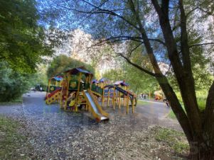 Благоустроенный двор, летом утопающий в зелени, уличное освещение, современные детские и спортивные площадки, площадь для парковки.