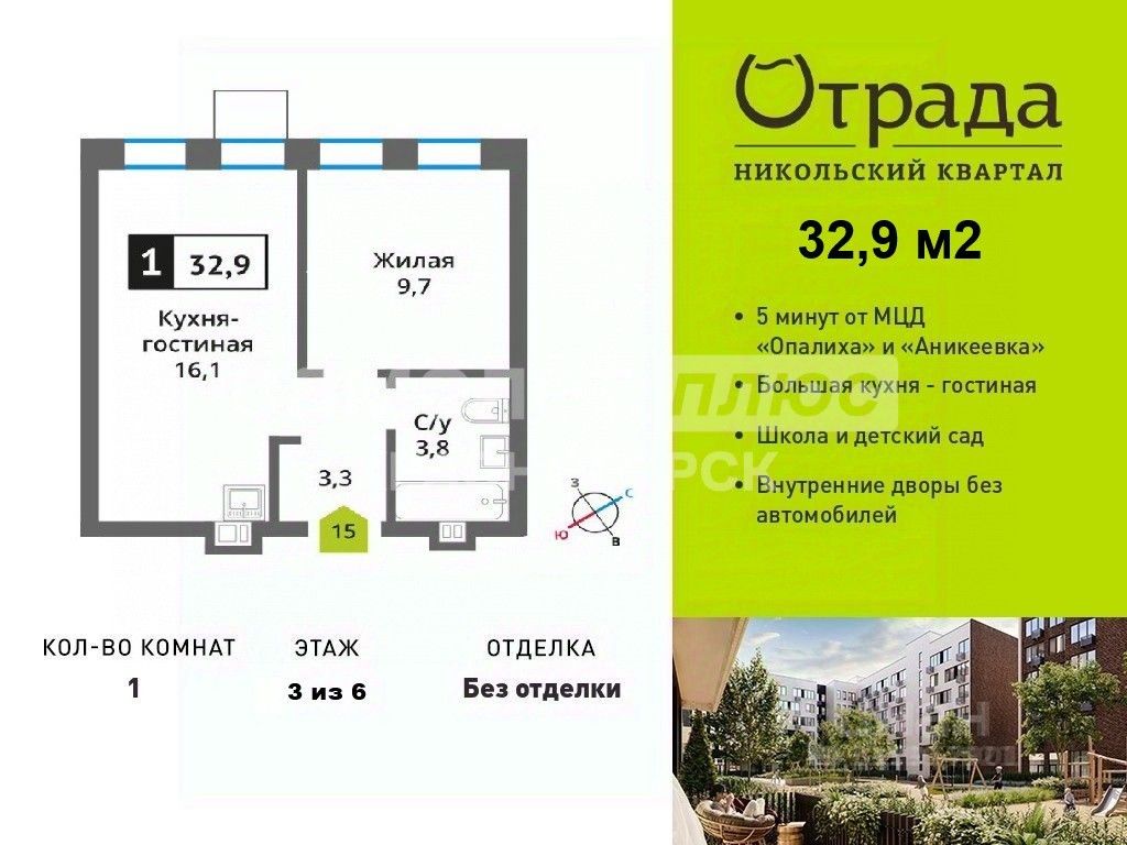 Продается 1-комнатная квартира от застройщика в ЖК "Никольский квартал Отрада" на 3 этаже. Общая площадь: 32.9 кв.м., жилая: 9.7 кв.м.