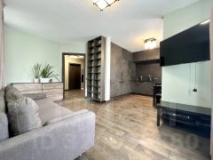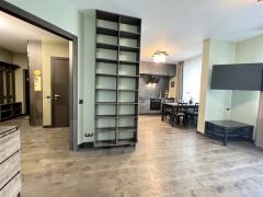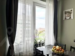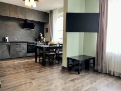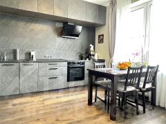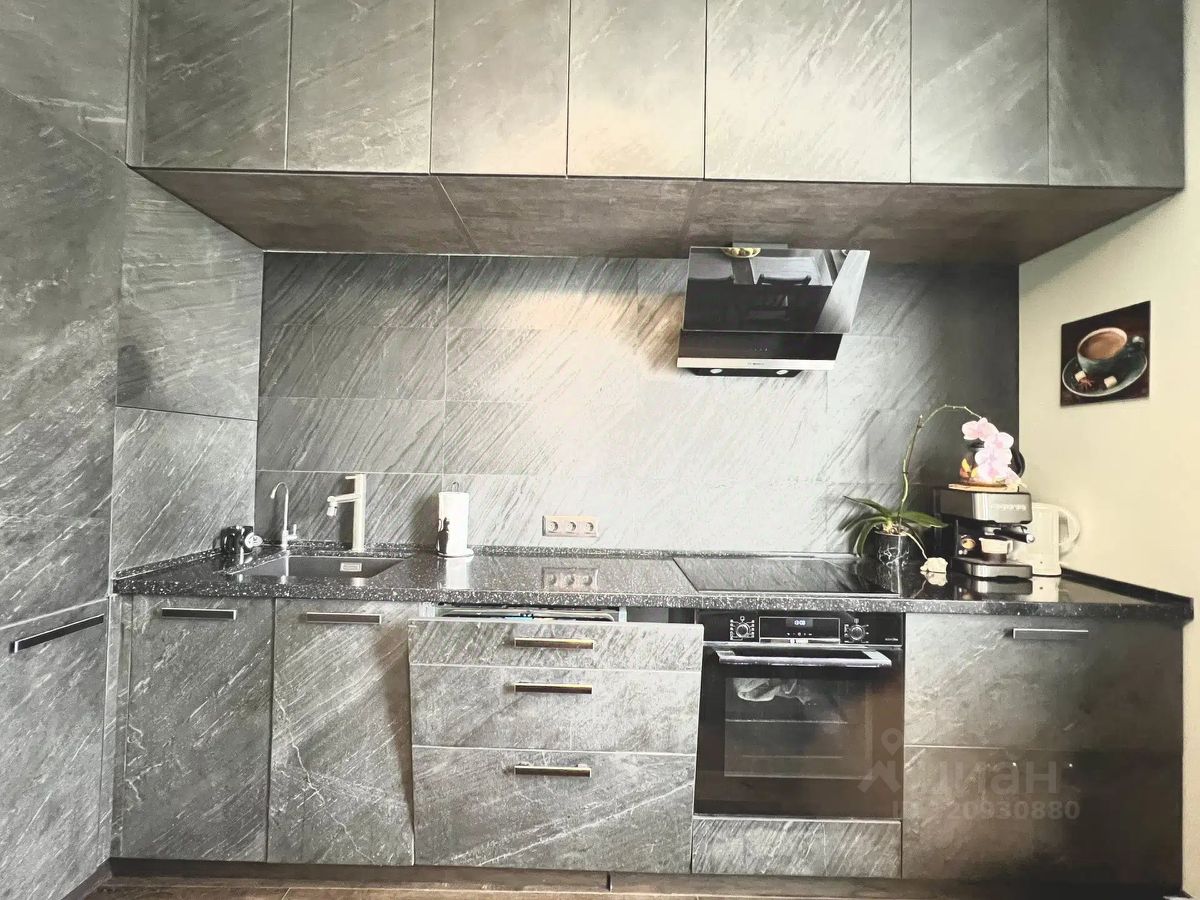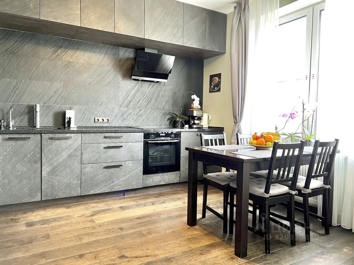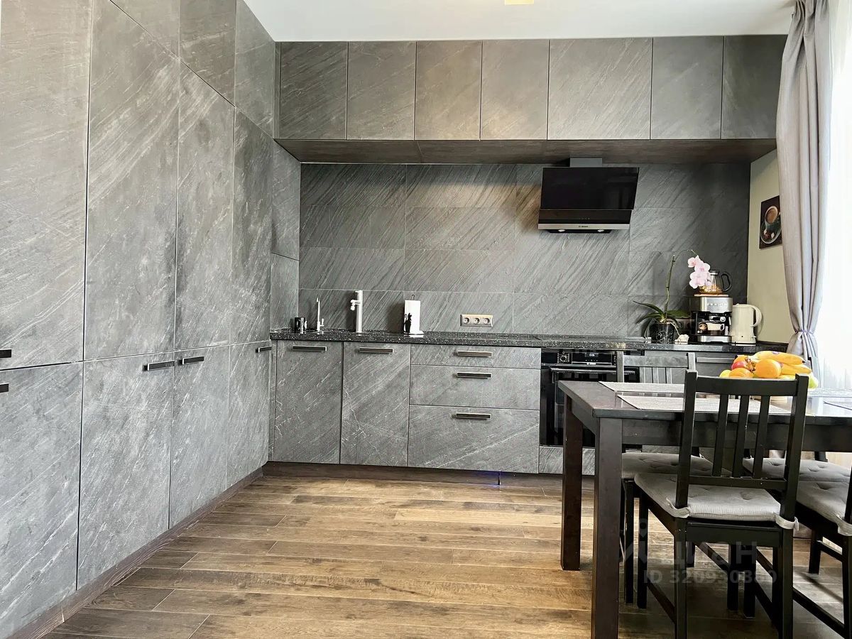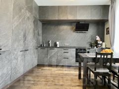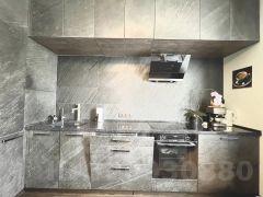 Кухня 11,7 кв. м. объединена с комнатой 15,00 кв. м. с выходом на лоджию 6,1 кв. метров. Кухонный гарнитур угловой, укомплектован всей необходимой техникой: индукционная панель, посудомоечная машина, духовой шкаф, вытяжка. Фасады сплошные под потолок, каменный шпон, столешница - искусственный камень, кварц. Очень много места для хранения.