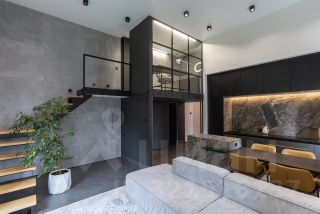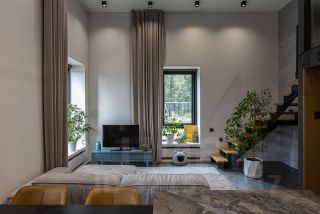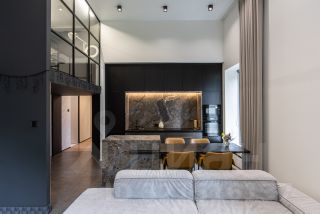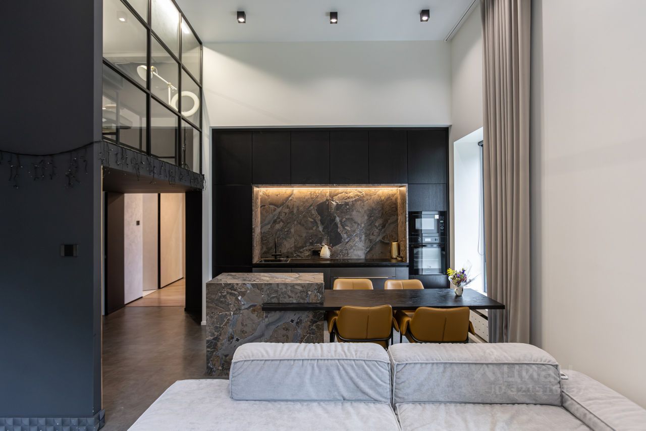 Из прихожей мы попадаем в просторную кухню-гостиную 30 кв. м с тремя окнами, с островом из натурального керамогранита, мягкой мебелью и всей бытовой техникой. В гостиной есть лестница, ведущая на второй уровень (антресоль), где расположен полностью шумо-изолированный, отлично освещенный кабинет 6,5 кв.м.