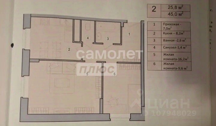 Арт. 116305727 - Просторная и светлая: 50 м с удобной функциональной планировкой, высокие потолки 2,8 м.