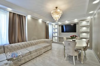 •	Отличное состояние: Ламинат и плитка на полу, многоуровневые потолки с точечным освещением, выровнены стены, санузлы в плитке.