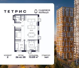 Продается квартира в ЖК Тетрис с 2 спальнями на 26 этаже 28 этажного дома. Общая площадь: 72.83 кв.м. Высота потолков 2.95 м. Срок сдачи 2 квартал 2026 г. Эскроу-счет. Застройщик ГК "Садовое кольцо".