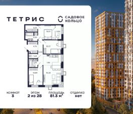 Продается квартира в ЖК Тетрис с 3 спальнями на 2 этаже 28 этажного дома. Общая площадь: 81.3 кв.м. Высота потолков 2.95 м. Дом сдан. Мастер-спальня. Окна выходят на 2 стороны. Зимний сад. Гардеробная. Эскроу-счет. Застройщик ГК "Садовое кольцо".