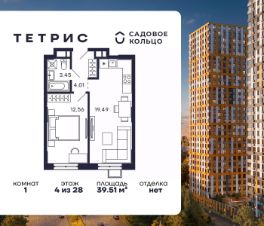 Продается квартира в ЖК Тетрис с 1 спальней на 4 этаже 28 этажного дома. Общая площадь: 39.51 кв.м. Высота потолков 2.95 м. Срок сдачи 2 квартал 2026 г. Эскроу-счет. Застройщик ГК "Садовое кольцо".