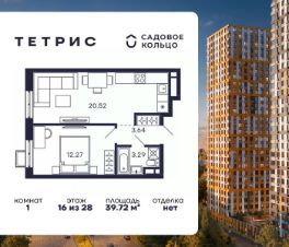 Продается квартира в ЖК Тетрис с 1 спальней на 16 этаже 28 этажного дома. Общая площадь: 39.72 кв.м. Высота потолков 2.95 м. Срок сдачи 2 квартал 2026 г. Эскроу-счет. Застройщик ГК "Садовое кольцо".