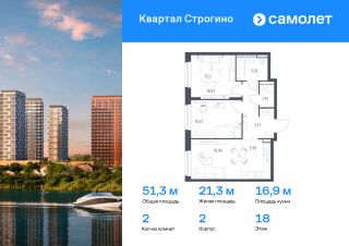 Предлагается 2-комнатная квартира комфорт-класса 51,26 кв.м в корпусе 2 на 18 этаже, в ЖК "Квартал Строгино"