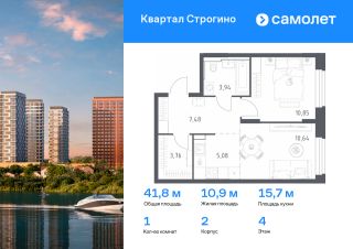 Строим кварталы для жизни с заботой о будущем. Предлагается 1-комнатная квартира комфорт-класса 41,75 кв.м в корпусе 2 на 4 этаже, в ЖК "Квартал Строгино"