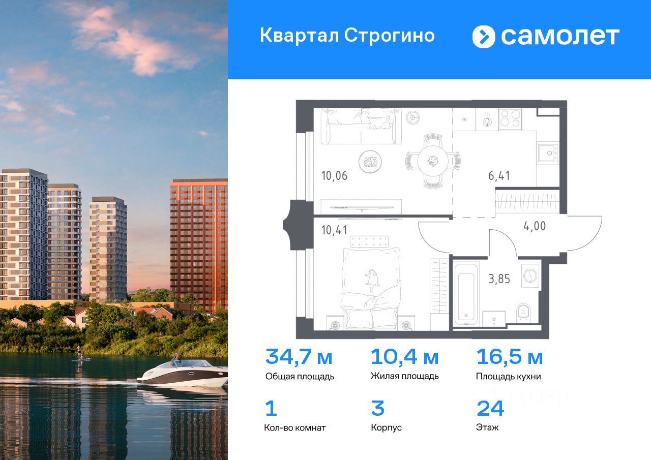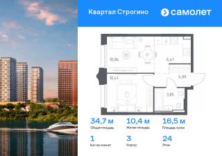 Предлагается 1-комнатная квартира комфорт-класса 34,73 кв.м в корпусе 3 на 24 этаже, в ЖК "Квартал Строгино"