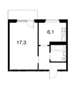 Площадь кухни 6,1 кв.метр, комнаты 17,3 кв.метров.