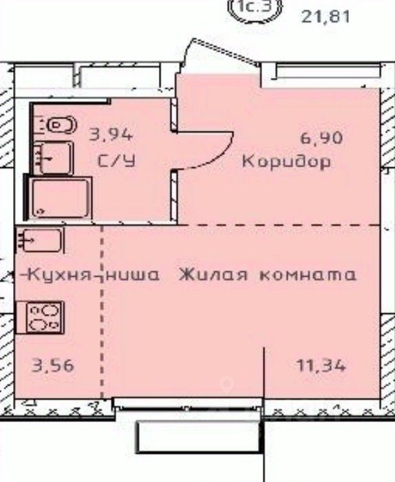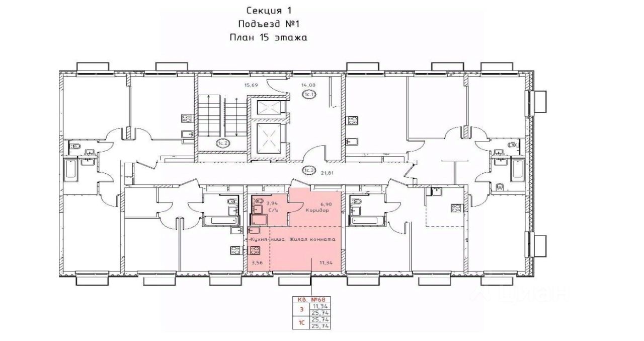 — Площадь квартиры 25,7 м2, жилая 11,4 м2, кухня-ниша 3.6 м2, С/У 3,9 м2;