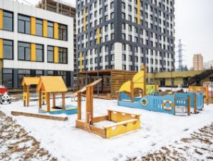 Есть подземная платная парковка. Во дворе обустроена территория - с качелями, лавочками, детской площадкой. Рядом построены школа и детский сад.
