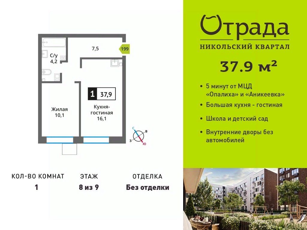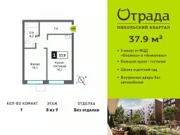Однокомнатная квартира (евродвушка) с просторной кухней-гостиной в жилом комплексе комфорт-класса "Никольский квартал Отрада". Планировка выполнена по современным стандартам и отличается повышенным комфортом. Квартал расположен в удачной локации, которая сочетает благоприятную экологическую обстановку с прекрасной транспортной доступностью. Проектом предусмотрены 14 корпусов высотой 6-9 этажей, а также муниципальная школа, один муниципальный и один частный детский сад, два наземных многоуровневых паркинга с кладовыми помещениями. Надежный застройщик ГК "Отрада" с высочайшим рейтингом 5 звезд от портала ЕРЗ. Все корпуса во всех ЖК сданы раньше срока!