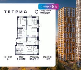 Продается квартира в ЖК Тетрис с 3 спальнями на 3 этаже 28 этажного дома. Общая площадь: 81.09 кв.м. Высота потолков 2.95 м. Срок сдачи 2 квартал 2026 г. Мастер-спальня. Эскроу-счет. Застройщик ГК "Садовое кольцо".