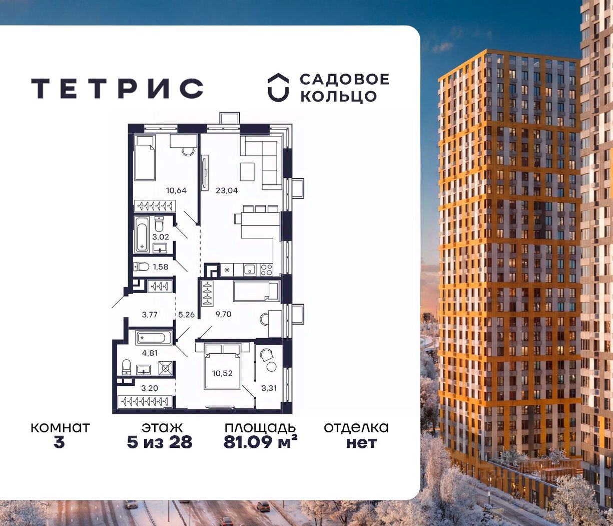 Продается квартира в ЖК Тетрис с 3 спальнями на 5 этаже 28 этажного дома. Общая площадь: 81.09 кв.м. Высота потолков 2.95 м. Срок сдачи 2 квартал 2026 г. Мастер-спальня. Вид на парк. Эскроу-счет. Застройщик ГК "Садовое кольцо".