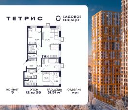 Продается квартира в ЖК Тетрис с 3 спальнями на 12 этаже 28 этажного дома. Общая площадь: 81.31 кв.м. Высота потолков 2.95 м. Срок сдачи 2 квартал 2026 г. Мастер-спальня. Вид на парк. Эскроу-счет. Застройщик ГК "Садовое кольцо".