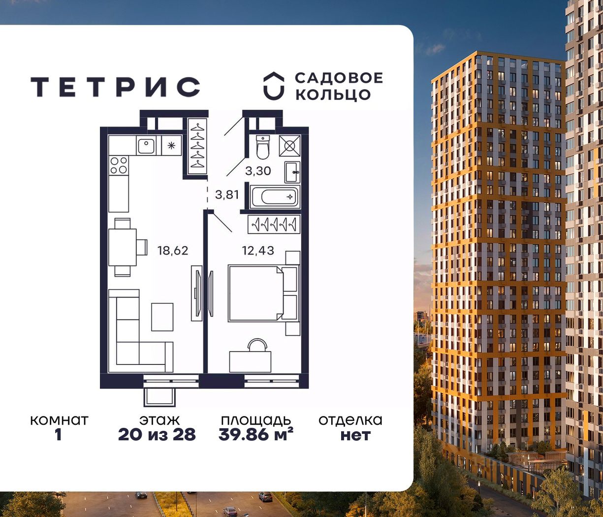 Продается квартира в ЖК Тетрис с 1 спальней на 20 этаже 28 этажного дома. Общая площадь: 39.86 кв.м. Высота потолков 2.95 м. Срок сдачи 2 квартал 2026 г. Эскроу-счет. Застройщик ГК "Садовое кольцо".