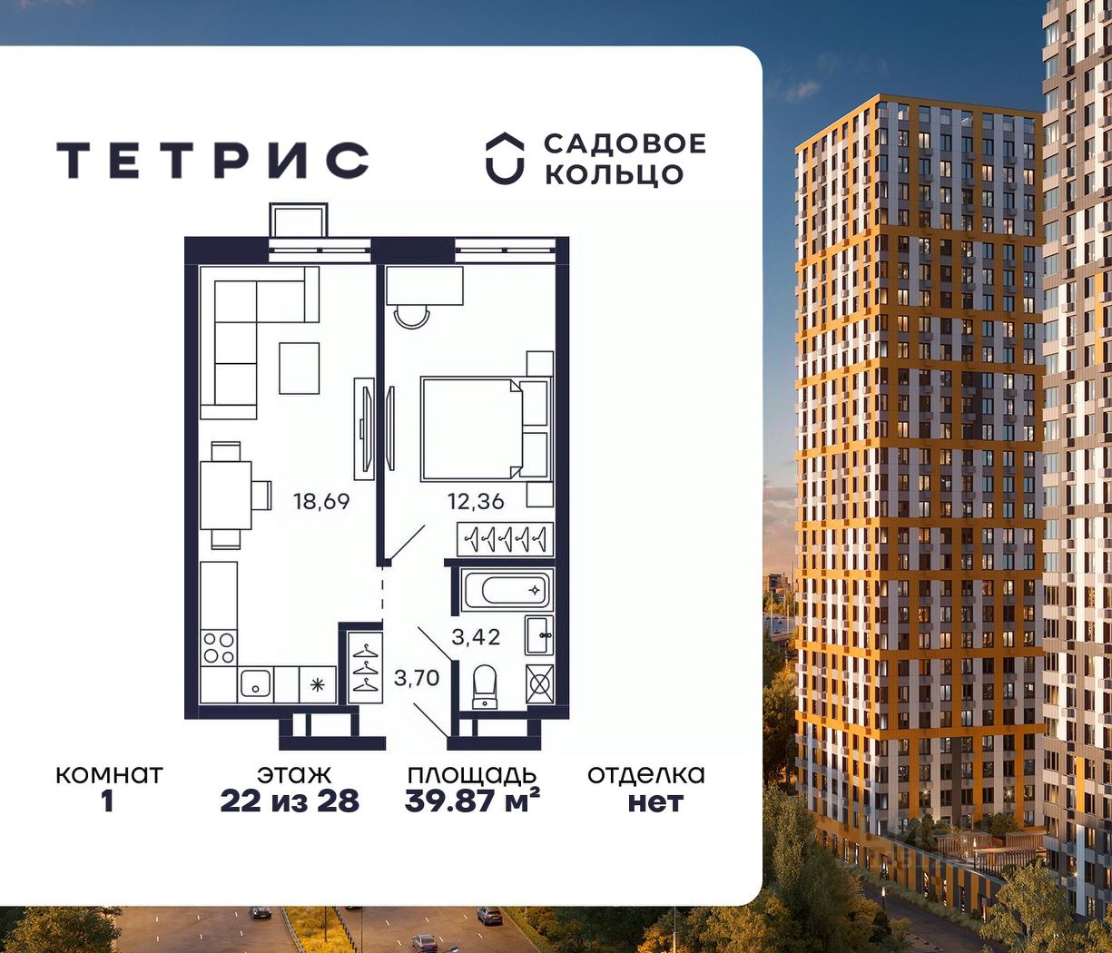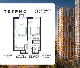 Продается квартира в ЖК Тетрис с 1 спальней на 22 этаже 28 этажного дома. Общая площадь: 39.87 кв.м. Высота потолков 2.95 м. Срок сдачи 2 квартал 2026 г. Эскроу-счет. Застройщик ГК "Садовое кольцо".