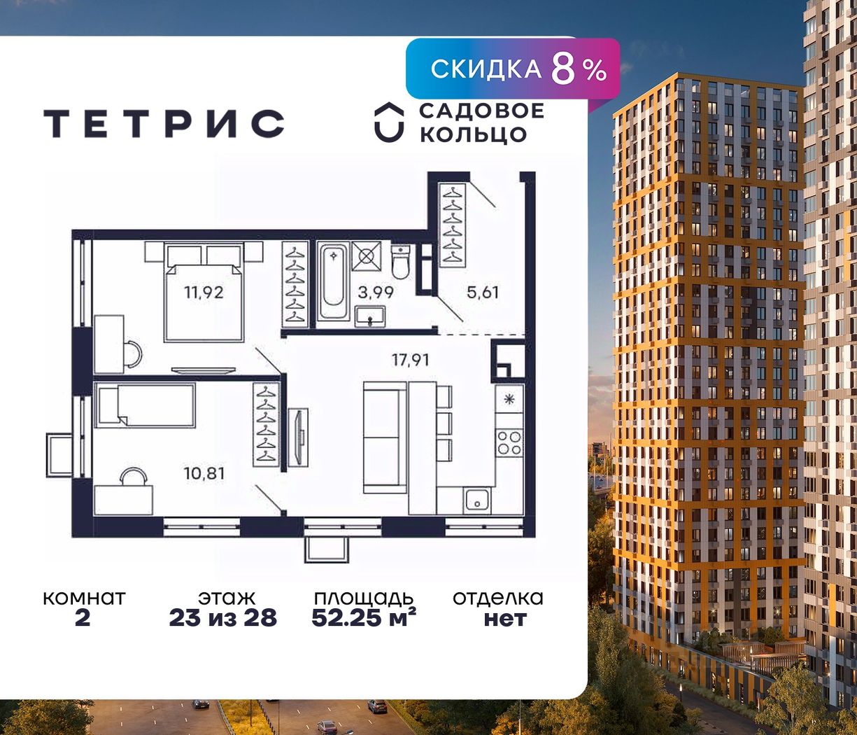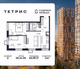 Продается квартира в ЖК Тетрис с 2 спальнями на 23 этаже 28 этажного дома. Общая площадь: 52.25 кв.м. Высота потолков 2.95 м. Срок сдачи 2 квартал 2026 г. Эскроу-счет. Застройщик ГК "Садовое кольцо".