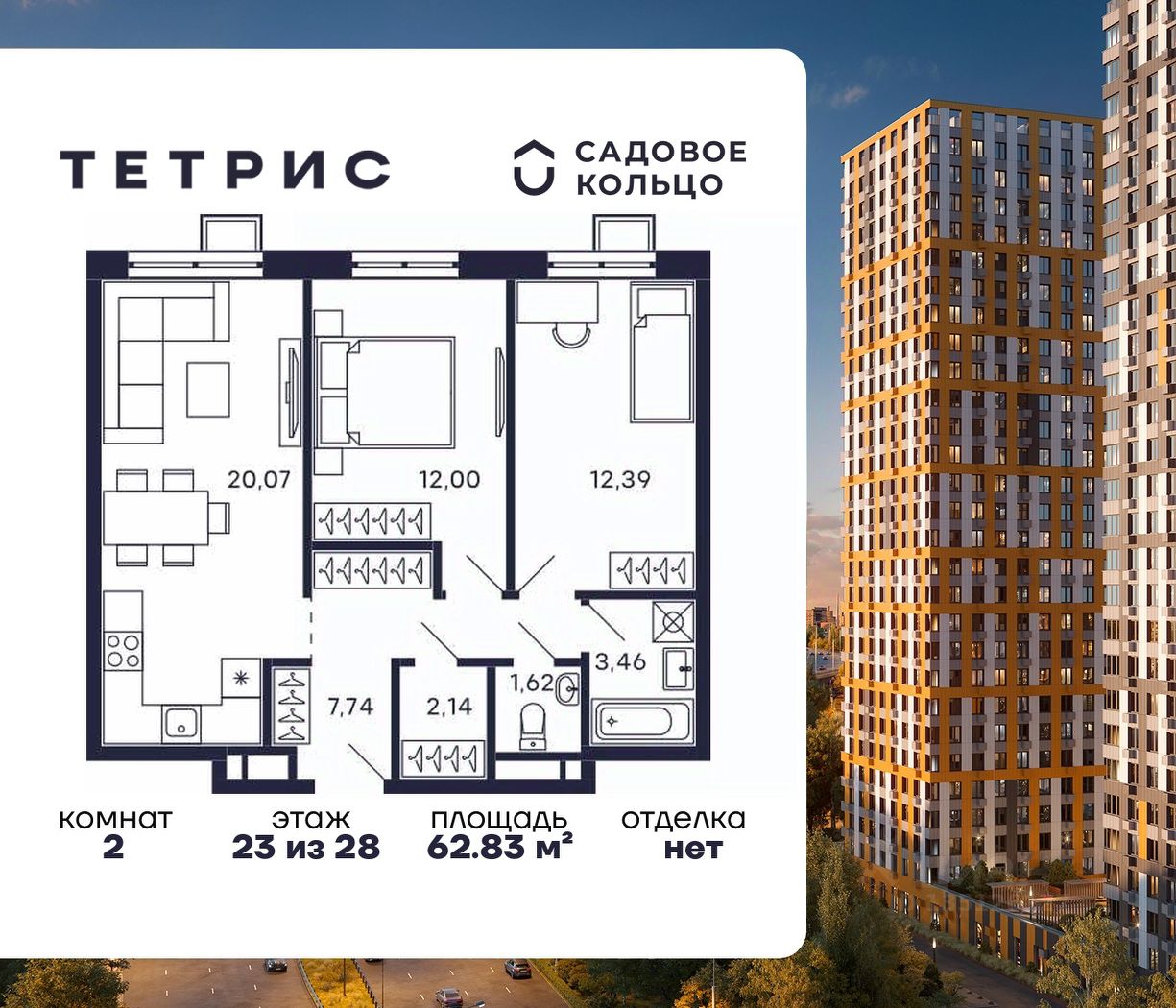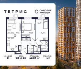 Продается квартира в ЖК Тетрис с 2 спальнями на 23 этаже 28 этажного дома. Общая площадь: 62.83 кв.м. Высота потолков 2.95 м. Срок сдачи 2 квартал 2026 г. Эскроу-счет. Застройщик ГК "Садовое кольцо".