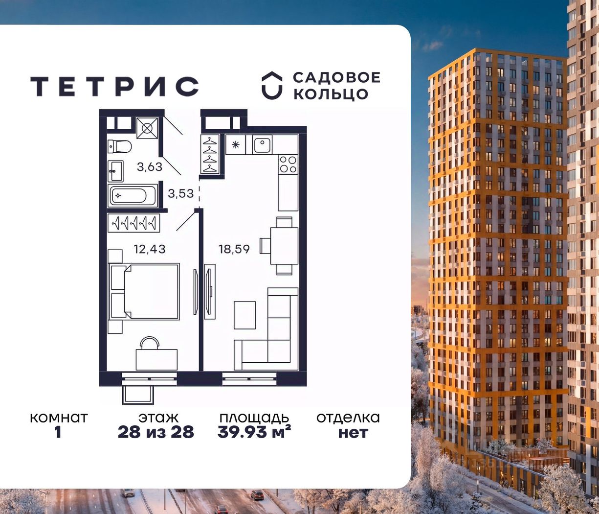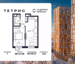 Продается квартира в ЖК Тетрис с 1 спальней на 28 этаже 28 этажного дома. Общая площадь: 39.93 кв.м. Высота потолков 2.95 м. Срок сдачи 2 квартал 2026 г. Эскроу-счет. Застройщик ГК "Садовое кольцо".