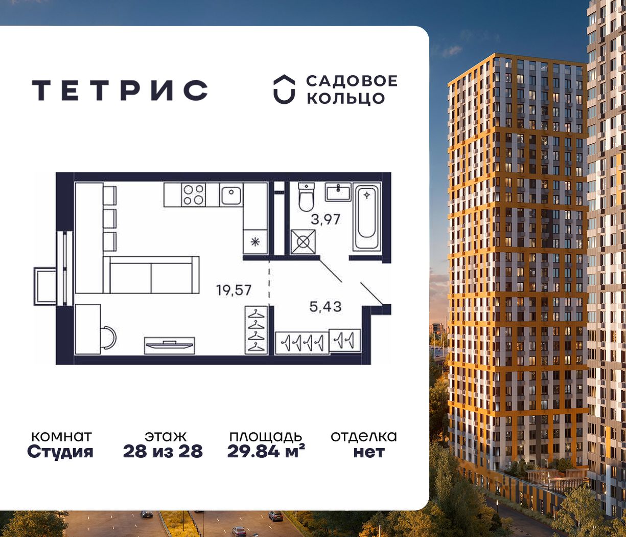 Продается квартира в ЖК Тетрис студия на 28 этаже 28 этажного дома. Общая площадь: 29.84 кв.м. Высота потолков 2.95 м. Срок сдачи 2 квартал 2026 г. Эскроу-счет. Застройщик ГК "Садовое кольцо".