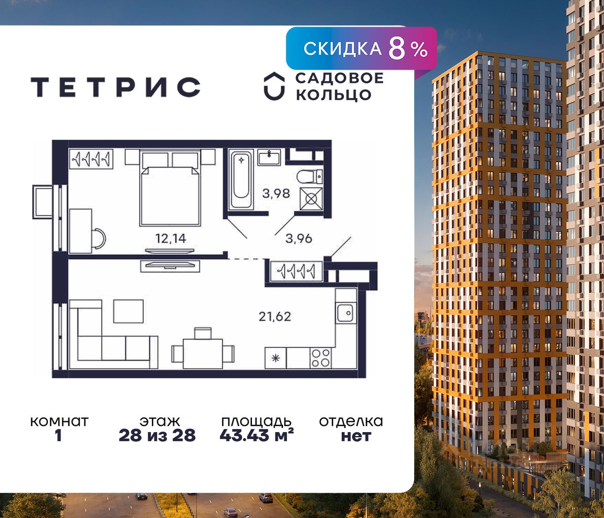 Продается квартира в ЖК Тетрис с 1 спальней на 28 этаже 28 этажного дома. Общая площадь: 43.43 кв.м. Высота потолков 2.95 м. Срок сдачи 2 квартал 2026 г. Эскроу-счет. Застройщик ГК "Садовое кольцо".