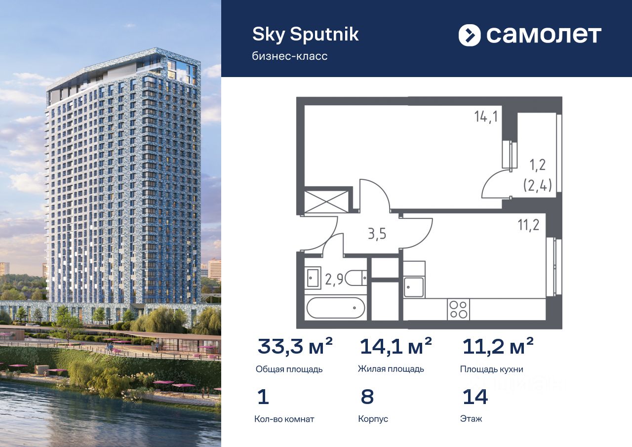 Строим кварталы для жизни с заботой о будущем. Предлагаются 1-комнатные апартаменты бизнес-класса 33,3 кв.м в корпусе 8 на 14 этаже, в Sky Sputnik