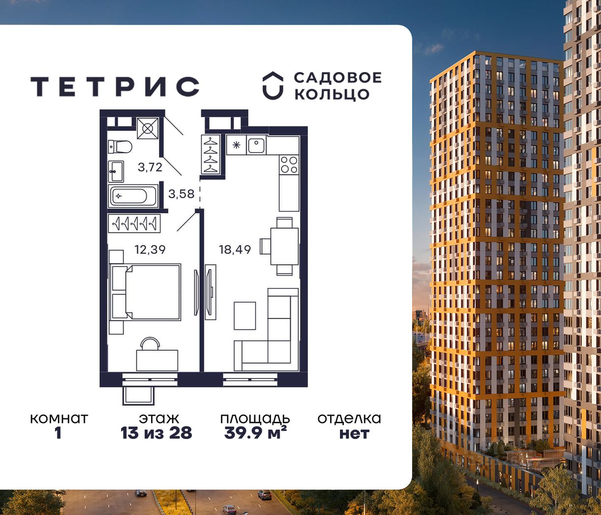 Продается квартира в ЖК Тетрис с 1 спальней на 13 этаже 28 этажного дома. Общая площадь: 39.9 кв.м. Высота потолков 2.95 м. Срок сдачи 2 квартал 2026 г. Эскроу-счет. Застройщик ГК "Садовое кольцо".