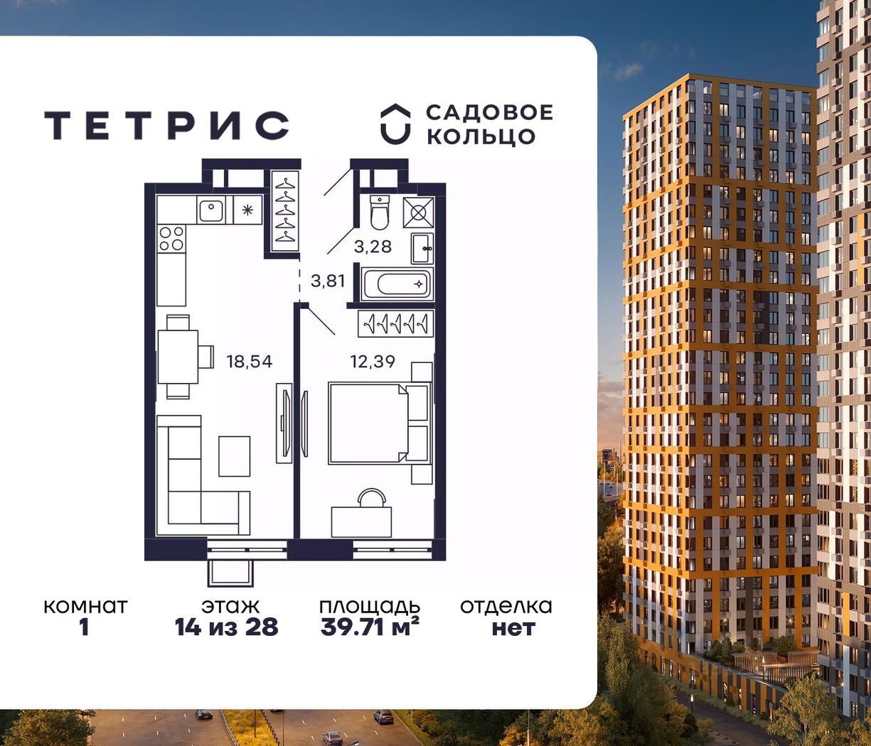 Продается квартира в ЖК Тетрис с 1 спальней на 14 этаже 28 этажного дома. Общая площадь: 39.71 кв.м. Высота потолков 2.95 м. Срок сдачи 2 квартал 2026 г. Эскроу-счет. Застройщик ГК "Садовое кольцо".
