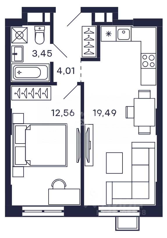 Функциональная планировка: кухня-гостиная + отдельная спальня, совмещённый санузел, качественная чистовая отделка.