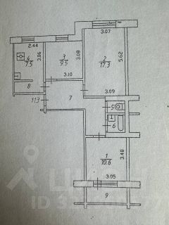 Комнаты: (17.3+10.6+9.5) кв.м