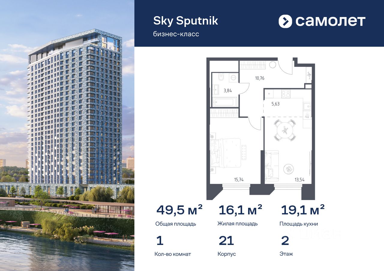 Строим кварталы для жизни с заботой о будущем. Предлагаются 1-комнатные апартаменты бизнес-класса 49,51 кв.м в корпусе 21 на 2 этаже, в Sky Sputnik