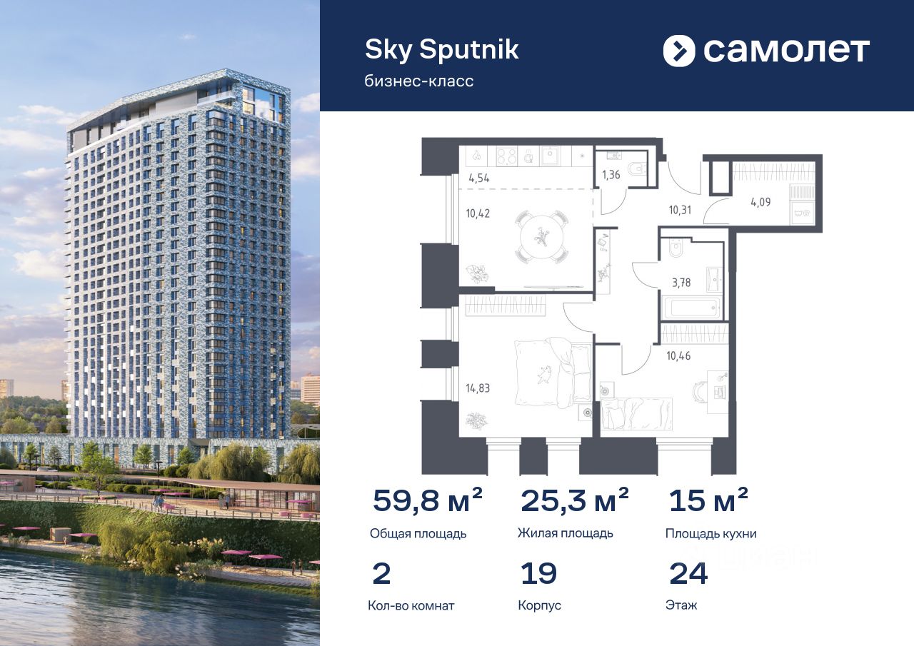 Строим кварталы для жизни с заботой о будущем. Предлагаются 2-комнатные апартаменты бизнес-класса 59,79 кв.м в корпусе 19 на 24 этаже, в Sky Sputnik