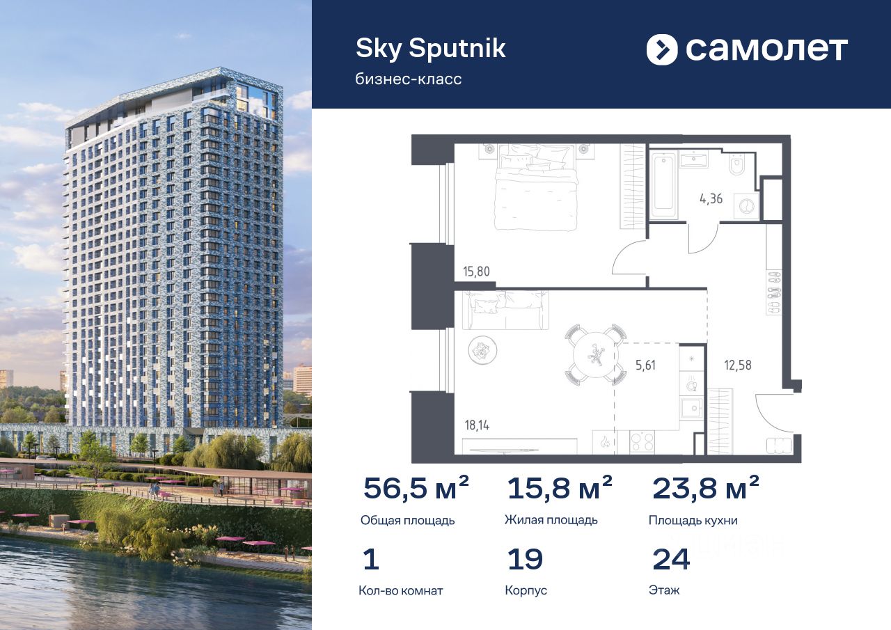 Строим кварталы для жизни с заботой о будущем. Предлагаются 1-комнатные апартаменты бизнес-класса 56,49 кв.м в корпусе 19 на 24 этаже, в Sky Sputnik