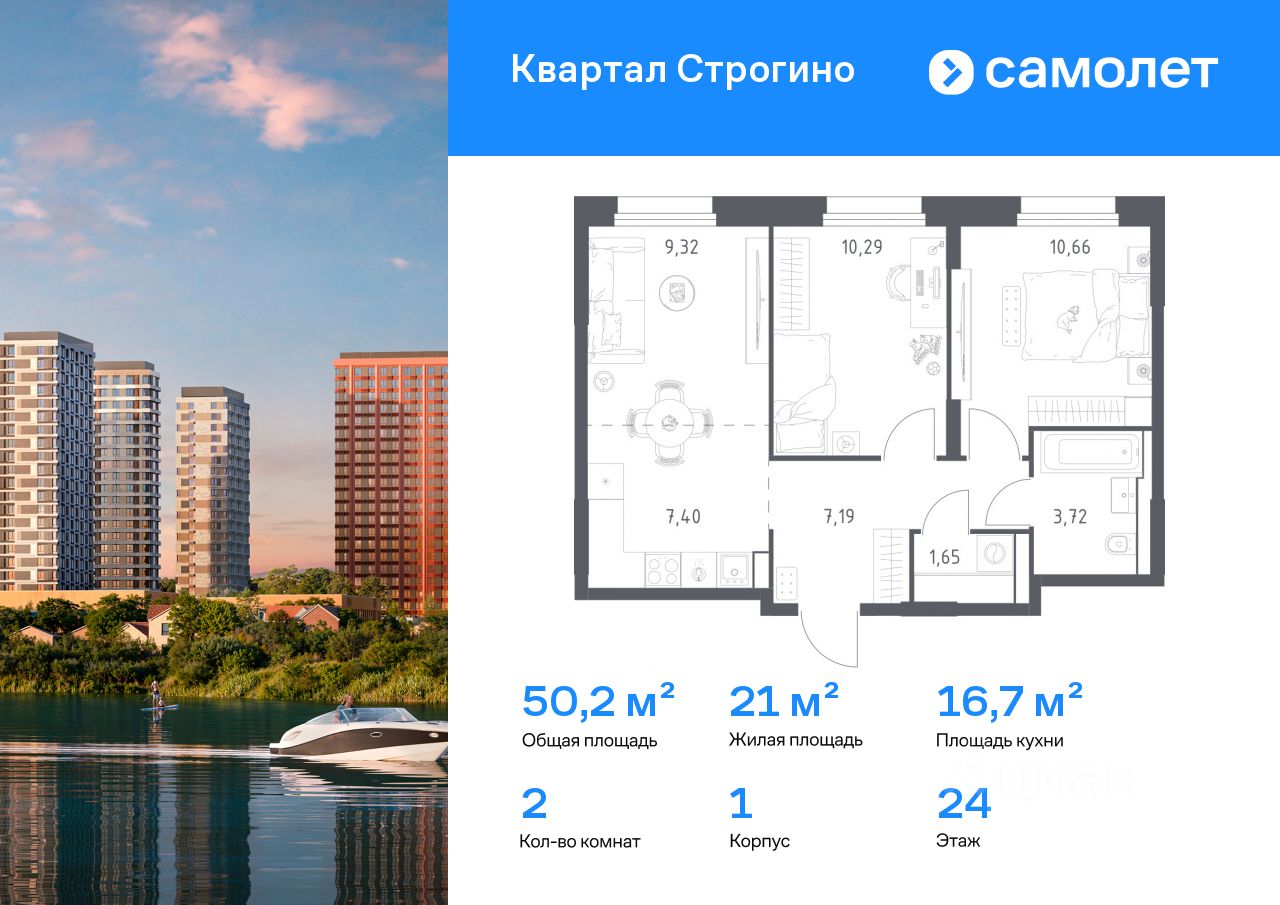 Строим кварталы для жизни с заботой о будущем. Предлагается 2-комнатная квартира комфорт-класса 50,23 кв.м в корпусе 1 на 24 этаже, в ЖК "Квартал Строгино"