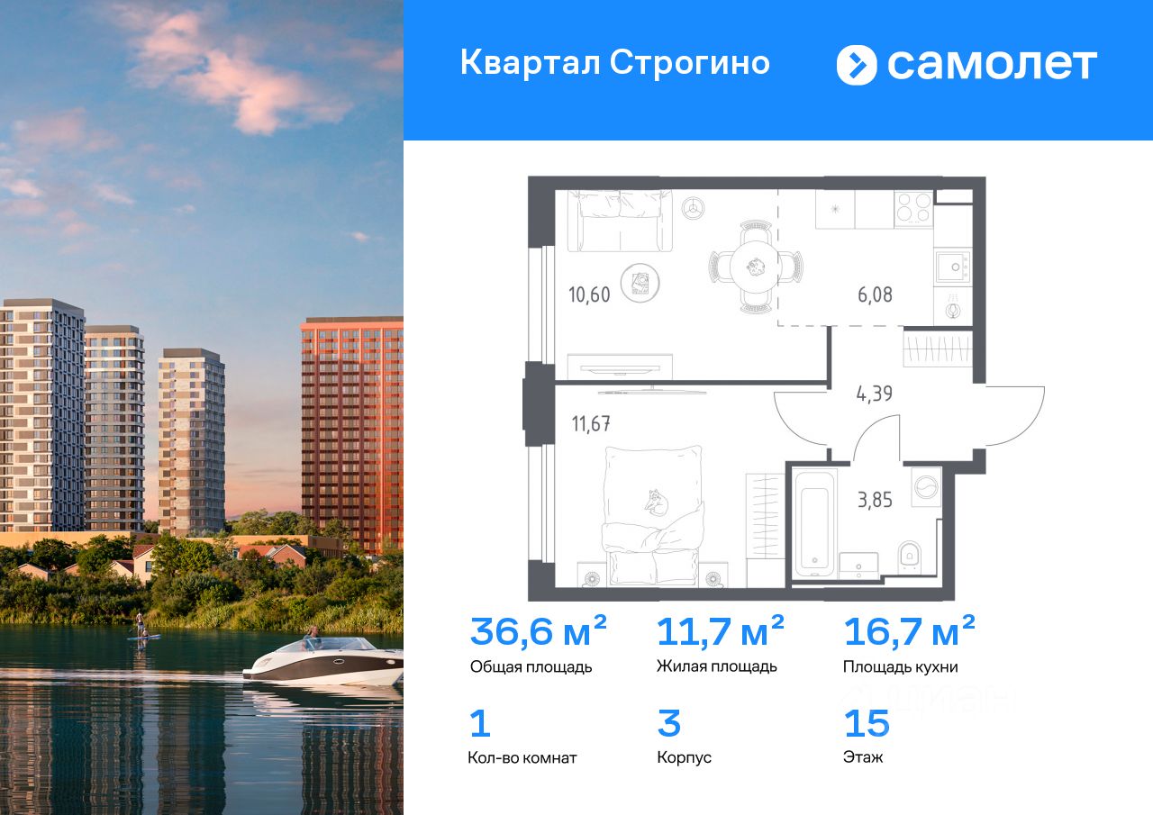 Строим кварталы для жизни с заботой о будущем. Предлагается 1-комнатная квартира комфорт-класса 36,59 кв.м в корпусе 3 на 15 этаже, в ЖК "Квартал Строгино"