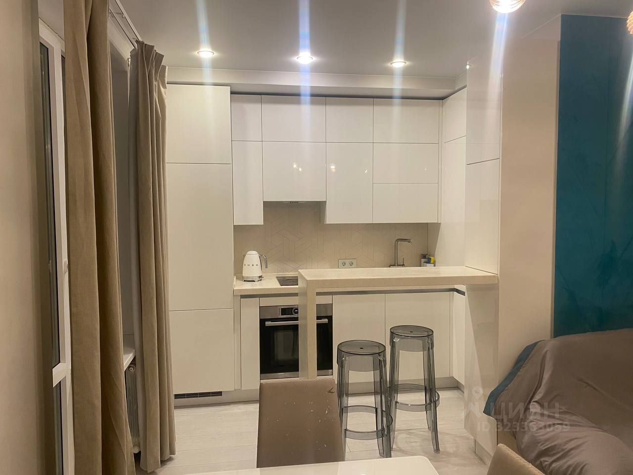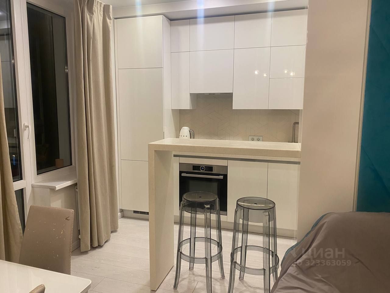 Встроенная кухня оснащена техникой Бош (холодильник, посудомоечная машина, плита, духовой шкаф с функцией микроволновки). Пол и стены выровнены под покраску, на полу уложен ламинат. Барная стойка, раковина и столешница выполнены из искусственного камня. В комнате установлен кондиционер и отдельный фильтр для воды.