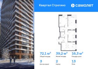 Строим кварталы для жизни с заботой о будущем. Предлагается 3-комнатная квартира комфорт-класса 72,11 кв.м в корпусе 2 на 13 этаже, в ЖК "Квартал Строгино"