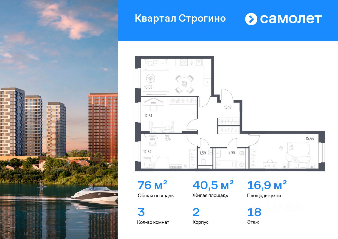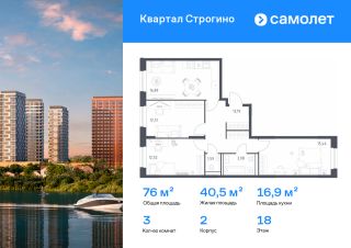 Строим кварталы для жизни с заботой о будущем. Предлагается 3-комнатная квартира комфорт-класса 76,04 кв.м в корпусе 2 на 18 этаже, в ЖК "Квартал Строгино"
