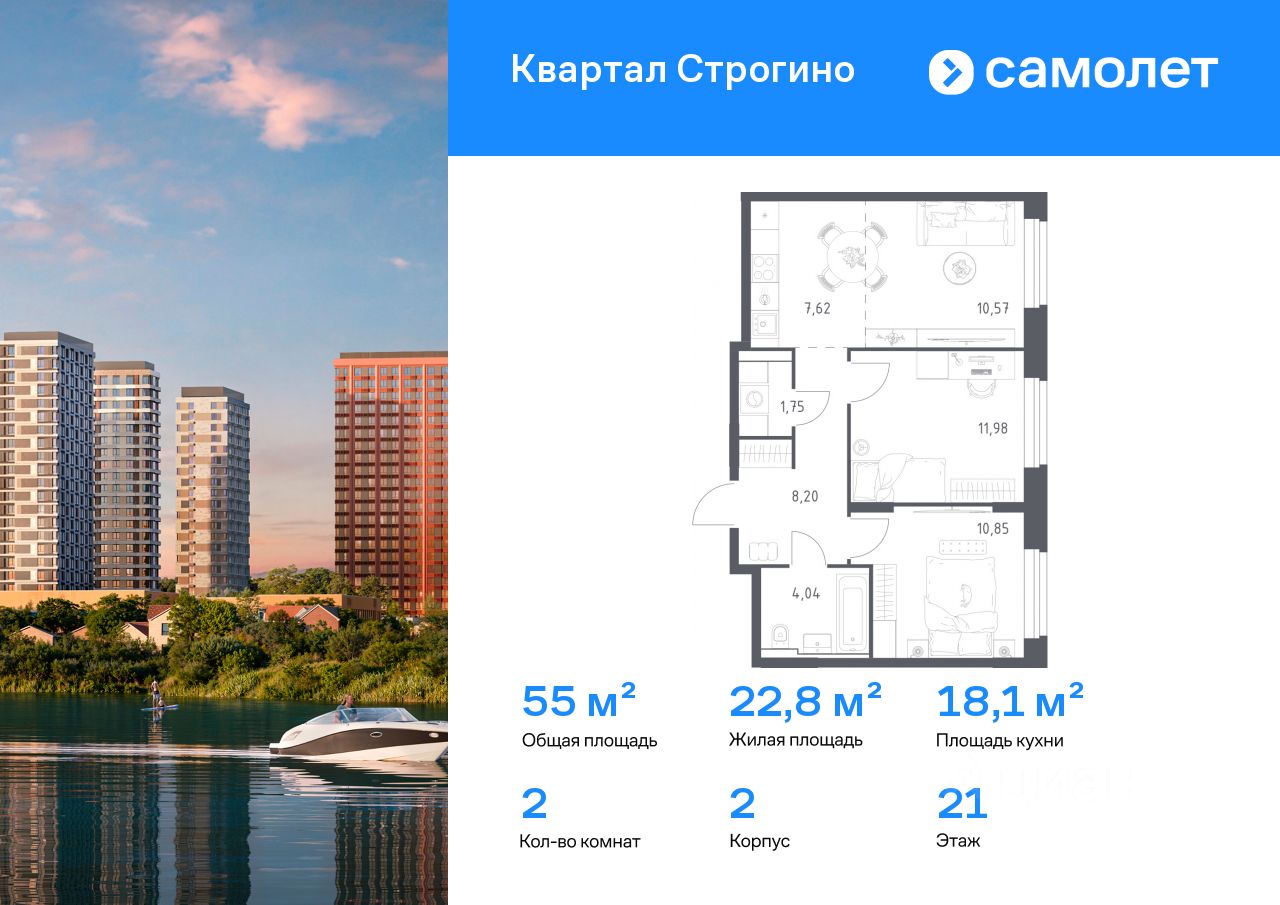 Строим кварталы для жизни с заботой о будущем. Предлагается 2-комнатная квартира комфорт-класса 55,01 кв.м в корпусе 2 на 21 этаже, в ЖК "Квартал Строгино"