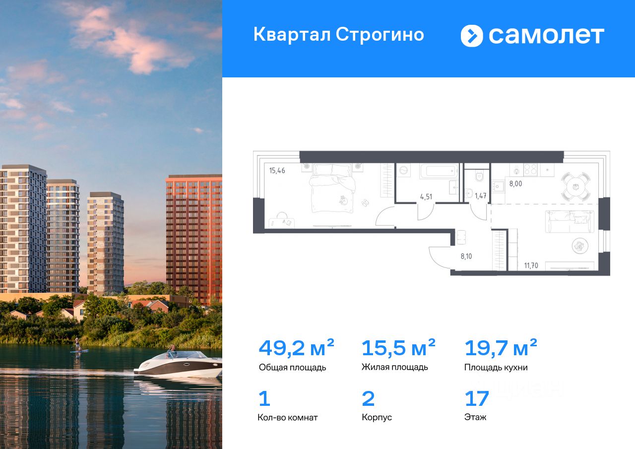 Строим кварталы для жизни с заботой о будущем. Предлагается 1-комнатная квартира комфорт-класса 49,24 кв.м в корпусе 2 на 17 этаже, в ЖК "Квартал Строгино"