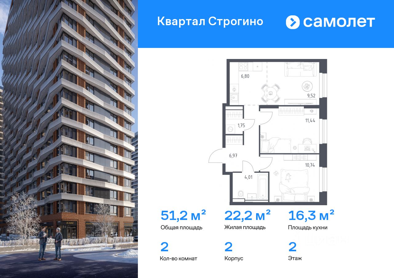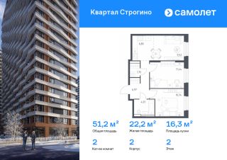 Строим кварталы для жизни с заботой о будущем. Предлагается 2-комнатная квартира комфорт-класса 51,23 кв.м в корпусе 2 на 2 этаже, в ЖК "Квартал Строгино"