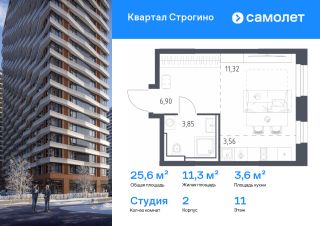 Строим кварталы для жизни с заботой о будущем. Предлагается квартира студия комфорт-класса 25,63 кв.м в корпусе 2 на 11 этаже, в ЖК "Квартал Строгино"