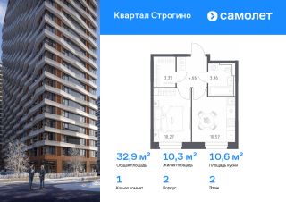 Строим кварталы для жизни с заботой о будущем. Предлагается 1-комнатная квартира комфорт-класса 32,85 кв.м в корпусе 2 на 2 этаже, в ЖК "Квартал Строгино"