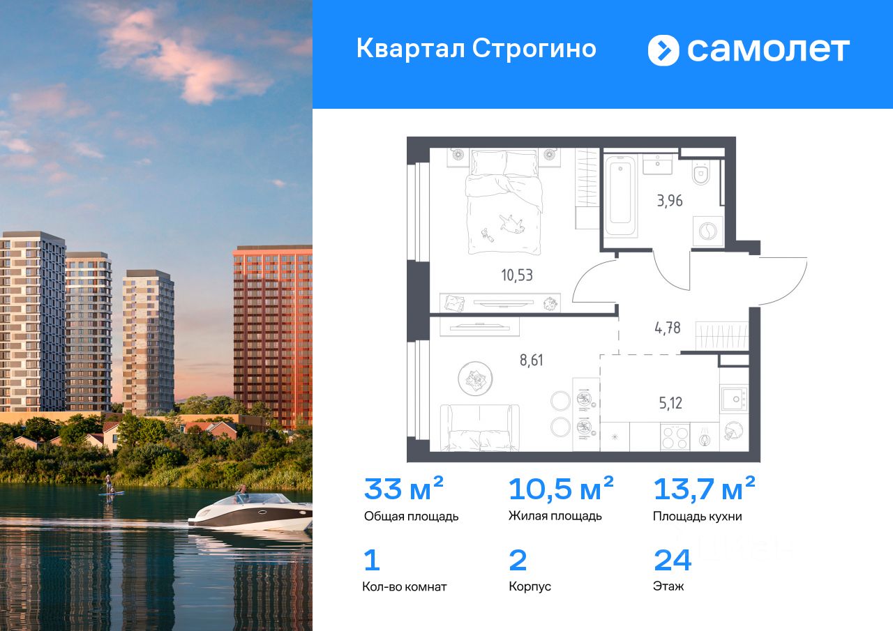 Строим кварталы для жизни с заботой о будущем. Предлагается 1-комнатная квартира комфорт-класса 33 кв.м в корпусе 2 на 24 этаже, в ЖК "Квартал Строгино"