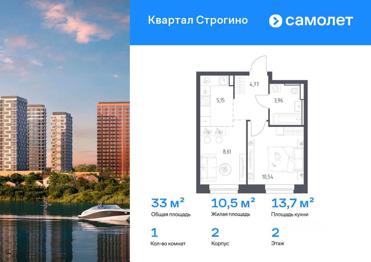 Строим кварталы для жизни с заботой о будущем. Предлагается 1-комнатная квартира комфорт-класса 33,03 кв.м в корпусе 2 на 2 этаже, в ЖК "Квартал Строгино"