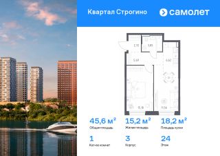 Строим кварталы для жизни с заботой о будущем. Предлагается 1-комнатная квартира комфорт-класса 45,62 кв.м в корпусе 3 на 24 этаже, в ЖК "Квартал Строгино"