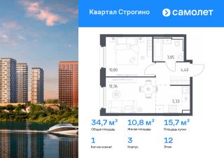 Строим кварталы для жизни с заботой о будущем. Предлагается 1-комнатная квартира комфорт-класса 34,74 кв.м в корпусе 3 на 12 этаже, в ЖК "Квартал Строгино"